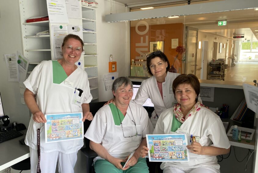 Auf allen Stationen, MVZs, in der Küche, der Verwaltung und der Operationsabteilung wurde ein Wimmelbild-Quiz verteilt. Die Teilnehmer wurden dazu aufgefordert, alle Händedesinfektionsmittel zu finden und die jeweiligen Indikationen zu benennen. Das Quiz war eine interaktive Art und Weise, das Wissen über die richtigen Handhygienetechniken und -momente zu überprüfen. Es förderte zudem das genaue Beobachten und das Bewusstsein für die Händehygiene im Klinikalltag.