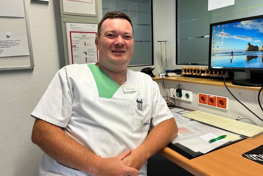 Das gilt nicht nur auf Station, sondern auch im ganzen Krankenhaus. Alle Berufsgruppen schätzen einander wert und arbeiten zusammen, berichtet Thomas. „Die Atmosphäre ist schön. Eine solche Wertschätzung und so ein gutes Team habe ich zuvor noch nie bei einem Arbeitgeber erlebt“, sagt der Krankenpfleger. Insbesondere das „hervorragende, freundschaftliche und respektvolle Verhältnis“ zwischen Pflegefachkräften und Ärzt*innen ist in der Paracelsus Klinik besonders. Mit einigen Kolleg*innen arbeitet Thomas bereits seit 25 Jahren zusammen. Bei Fragen und Problemen steht ihm der Pflegedienstleiter Thomas Meinel jederzeit zur Seite.