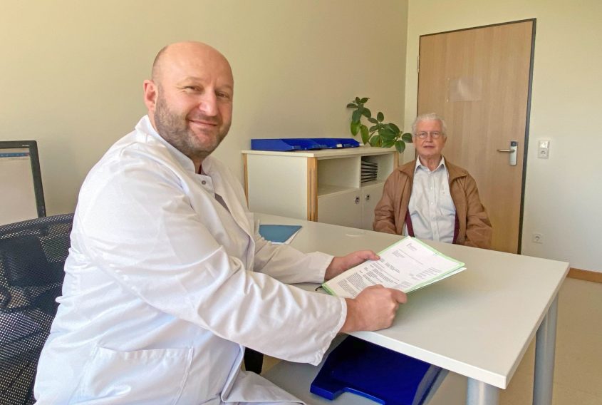 Foto: Dr. med. Roman Koch, Chefarzt der Allgemein- und Viszeralchirurgie an der Paracelsus-Klinik in Henstedt-Ulzburg (l.) im Gespräch mit Patient Peter Kratsch.