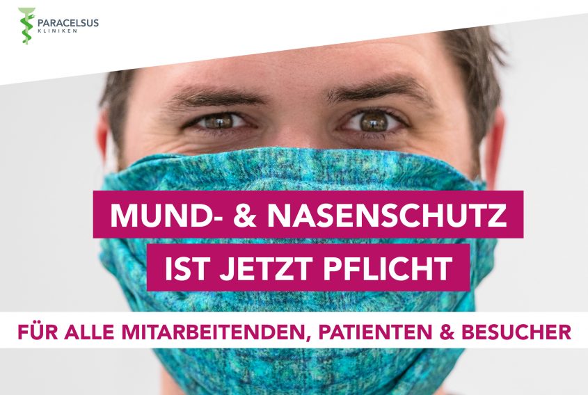Als weitere vorbeugende Maßnahme und zum Schutz unserer Patienten, Mitarbeiter und Besucher vor dem Corona-Virus besteht ab dem 27. April 2020 in allen Einrichtungen der Paracelsus-Kliniken die Pflicht, einen Mund-Nasen-Schutz (MNS) zu tragen. Besucher und Patienten werden gebeten, einen eigenen MNS mit in die Kliniken zu bringen.