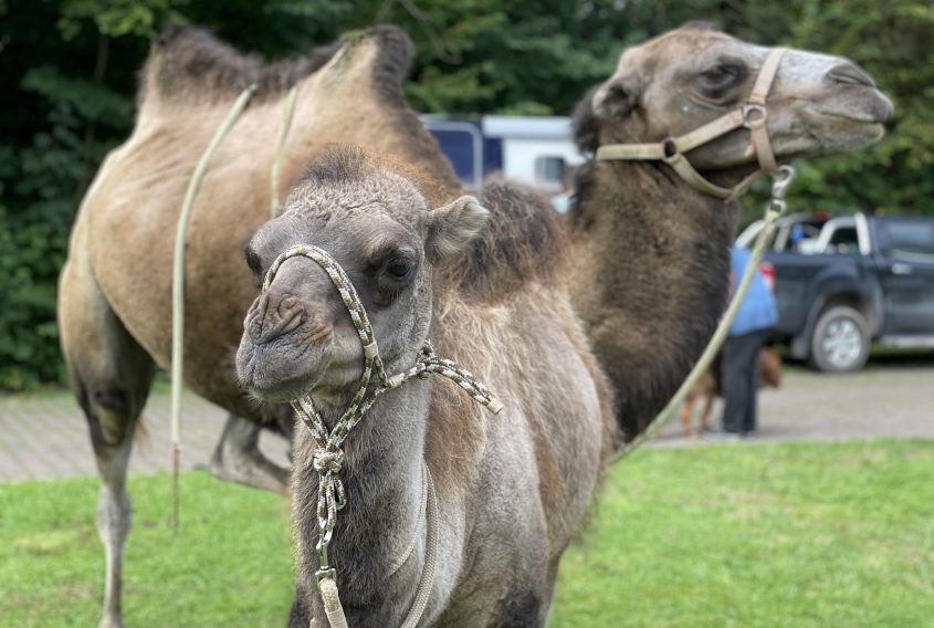 Die Paracelsus Roswithaklinik ist seit mehr als 25 Jahren eine der größten psychosomatischen Rehabilitationskliniken in Niedersachsen. Neben der im Vordergrund stehenden Psychotherapie bietet die Klinik seit Oktober 2019 tiergestützte Therapie, anfangs mit einem Therapiehund und seit August 2020 zusätzlich mit Alpakas, Kamelen, Pferden und Co in Kooperation mit Heiko Bock, Reittherapeut und Hofbesitzer von Oscars Farm – Therapiehof in Ertinghausen im Sollingan. Damit erweitert die Rehaklinik ihr umfangreiches Angebot um besondere „Co-Therapeuten“. Seit inzwischen einem Jahr kommen regelmäßig am Wochenende unterschiedliche Tierarten nach Bad Gandersheim. Der ein oder andere hat die Alpakas im Kurpark bei einem Spaziergang vielleicht schon erblickt? Vergangenes Wochenende konnte die Patienten der Roswithaklinik eine Kamelstute und ihre Tochter begrüßen. Klares Highlight war die Säuglingsfütterung mit der Flasche. „Wir freuen uns, dass wir das Angebot der tiergestützten Therapie in Kooperation mit Herrn Bock weiter ausbauen konnten“, resümiert Chefärztin Dr. med. Kirsten Buchenau zufrieden. Aktuell profitieren wöchentlich 64 Patientinnen und Patienten von diesem Angebot. In Kleingruppen lernen sie auf wohltuende Weise, achtsam im Hier und Jetzt zu sein, Körpersprache und innere Haltung in Einklang zu bringen und dadurch ihr Selbstwertgefühl zu stärken. Ganz nebenbei zaubern die unterschiedlichen Vierbeiner jedem ein Lächeln auf die Lippen.