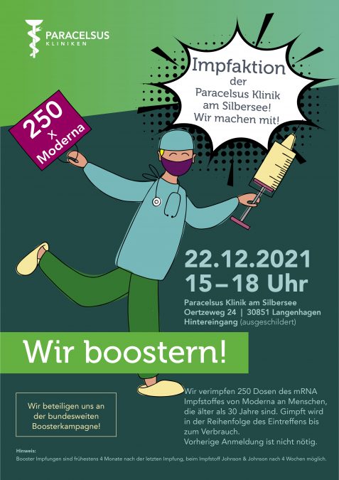 Die Paracelsus Klinik in Langenhagen beteiligt sich an der bundesweiten Boosterkampagne. Am Mittwoch, den 22.12.2021 wird zwischen 15.00-18.00 Uhr in der Klinik geboostert. Es stehen rund 250 Impfdosen zur Verfügung.