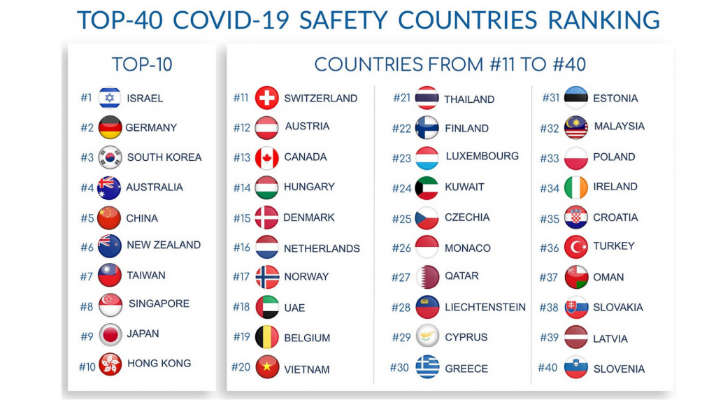 Die Bundesrepublik ist einem Ranking zufolge derzeit das sicherste und stabilste Land in Europa und sogar das zweitsicherste der Welt. Nur Israel managt die Krise besser, heißt es im Ländervergleich der Londoner Deep Knowledge Group (DKG). In einem Ranking von über hundert Staaten liegen beispielsweise die USA nur auf Platz 70. Unter den weltbesten zehn Ländern finden sich darin gleich hinter Israel und Deutschland Südkorea, Australien und China. Bei der Behandlungseffizienz liegt Deutschland sogar auf Platz 1.