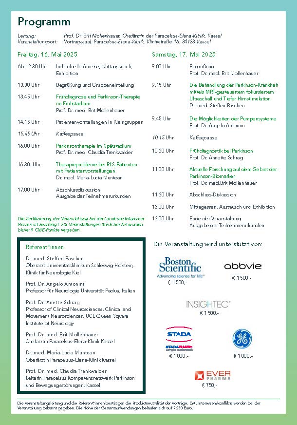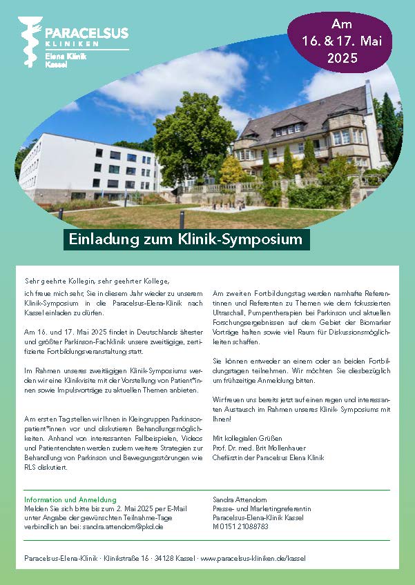 In diesem Jahr laden wir Neurologen und alle interessierten Ärzte wieder zu unserer zweitägigen zertifizierten Fortbildungsveranstaltung in die Paracelsus-Elena-Klinik ein. Am 16. und 17. Mai 2025 findet in Deutschlands ältester und größter Parkinsonfachklinik das große Klinik-Symposium statt.
