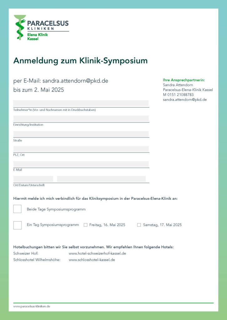 Die Teilnahme am Klinik-Symposium ist an einem oder an beiden Tagen möglich. Die Anmeldung erfolgt per Mail an sandra.attendorn@pkd.de, Anmeldeschluss ist der 2. Mai 2025.
