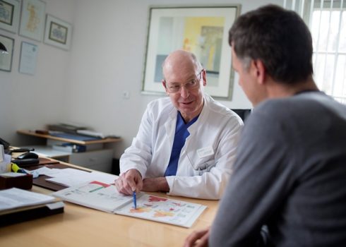 Prof. Dr. Johannes Wolff, Chefarzt der Paracelsus Klinik Golzheim Düsseldorf, berät einen Patienten zu Therapiemöglichkeiten bei Hodenkrebs