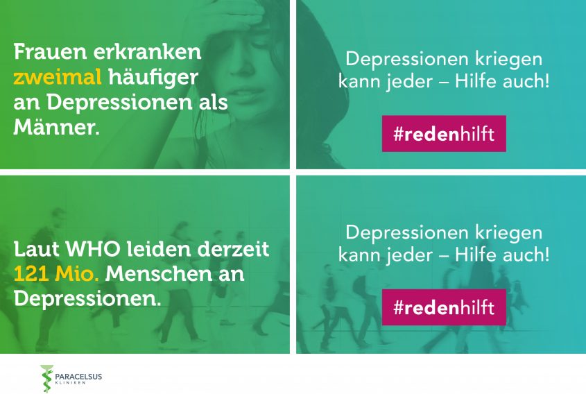 Mit einer eigens gestalteten Online-Kampagne wollen die Paracelsus Rehakliniken im Oktober Menschen mit psychischen Erkrankungen den Weg in eine professionelle psychosomatische Behandlung aufzeigen. Anlass ist die Woche der Seelischen Gesundheit vom 10. bis 20. Oktober, die in diesem Jahr unter dem Motto „Reden hebt die Stimmung – Seelisch gesund in unserer Gesellschaft“ steht. Unter dem Hashtag #redenhilft erscheinen dazu im Facebook- und Instagram-Account der zehn Paracelsus-Rehakliniken Bildmotive mit Fakten zu psychischen Erkrankungen. Sie konfrontieren den Besucher mit Aussagen wie „Frauen erkranken zweimal häufiger an Depressionen als Männer“, „20% aller Kinder und Jugendlichen erleben noch vor ihrem 18. Lebensjahr eine depressive Episode“, oder „Durchschnittlich vergehen 11 Monate, bevor Menschen mit Depressionen ärztliche Hilfe in Anspruch nehmen.“ Wer neugierig geworden ist oder sich selbst wiedererkennt und darauf klickt, den erwartet der Slogan „Depressionen kriegen kann jeder – Hilfe auch!“ und ein Link auf die entsprechenden Webseiten der psychosomatischen Kliniken des Unternehmens, die konkrete Schritte und Kontakte für Hilfesuchende anbieten.