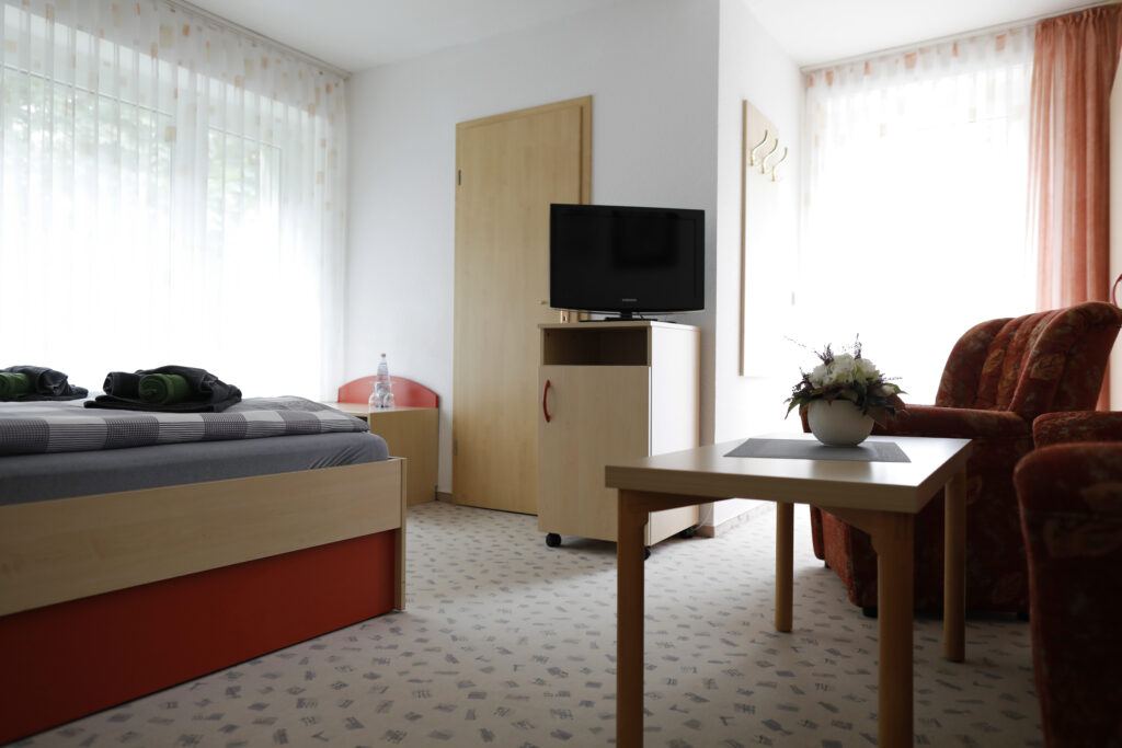 Wenn Sie mit Ihrem Partner oder einen Angehörigen anreisen möchten, besteht die Möglichkeit der gemeinsamen Unterbringung im gleichen Zimmer. Zusätzlich haben wir für unsere Gäste auch ein modern ausgestattetes Gästehaus mit Einzelzimmern, Doppelzimmern sowie Appartements, in dem eine Unterbringung ebenfalls möglich ist. Behindertengerechte Zimmer gehören ebenfalls zur Ausstattung des Hauses.