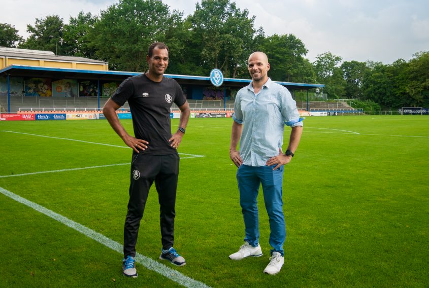 Bildunterschrift: Benjamin Eta, Cheftrainer des Bremer SV, freut sich über die Unterstützung von Dr. Alberto Schek, Chefarzt Sportmedizin und Prävention der Paracelsus Klinik Bremen.