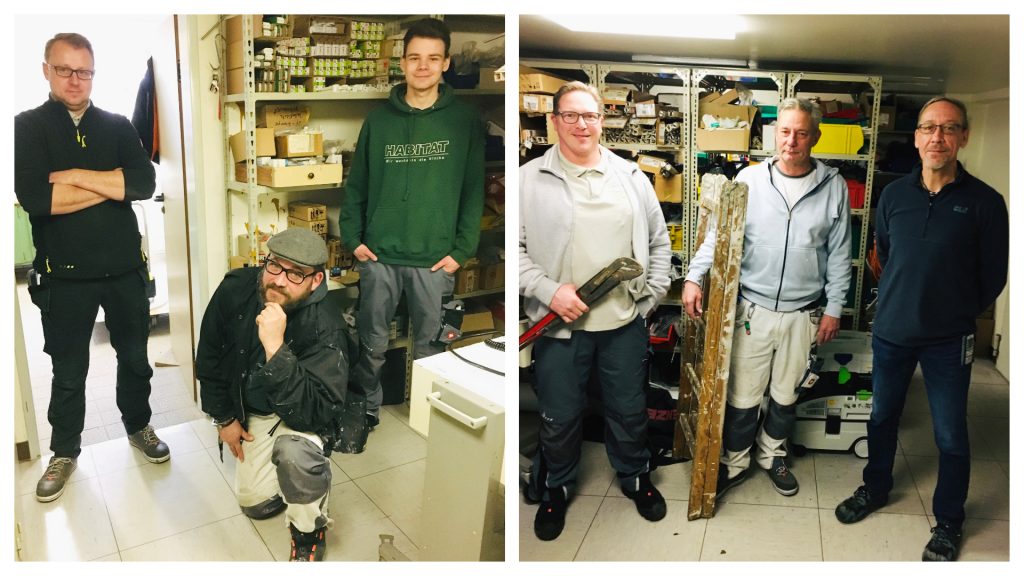 „In den letzten Wochen standen viele reguläre Aufgaben an und es kamen kurzfristige Aufträge dazu“, erklärt Dirk Weiß. Da wurde zum Beispiel der Empfang neu gestaltet, gestrichen und zum Schutz der Kollegen mit einem Plexiglas-Spuckschutz versehen. Außerdem wurden die durch den Brandschutz auf der Intensivstation noch offenen Arbeiten beendet oder mal eben schnell die sich lösende Decke des Windfangs vom Haupteingang erneuert. „Corona hält uns auf Trapp und erfordert ein flexibles Umdenken der täglichen Routine.“. Und flexibel sind unsere Männer. Warum? „Na, weil Golzheim unser zweites Zuhause ist und das soll rund laufen“, grinst Martin Aust. Natürlich hat er vergessen zu erwähnen, dass auch das Team gesund bleiben und niemanden gefährden möchte. Bescheiden wie immer…