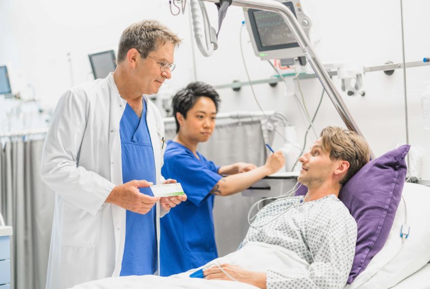 „Ziel unserer Behandlung ist immer eine möglichst schnelle und wirkungsvolle Schmerzreduktion“, erläutert Dr. Ringeler das Golzheimer Akutschmerzkonzept. „Wir streben an, die Menschen nach spätestens 15 Minuten schmerzfrei zu bekommen“, so der Facharzt weiter. Oft ist erst nach einer erfolgreichen Akutschmerzbehandlung eine urologische Ursachendiagnostik überhaupt möglich. Weil Kolikschmerz sehr häufig mit Übelkeit und Erbrechen einhergeht, müssen die Schmerzmittel in der Akutsituation ausschließlich intravenös verabreicht werden. Neben einer wirkungsvollen Schmerzmedikation brauchen die Menschen kontinuierliche Überwachung und Betreuung. Daher werden sie in „geschützte Bereiche“ der Klinik wie die Untersuchungsräume der Notfallambulanz, den Aufwachraum oder die Intensivstation gebracht, wo immer geschultes Personal vor Ort ist, das sich um die Menschen mit Schmerzen kümmert. Dazu gehört auch, nach jeder Schmerzmittelgabe regelmäßig erneut zu fragen, wie hoch die aktuelle Schmerzstärke eingeschätzt wird, um die Dosierung nachzujustieren.