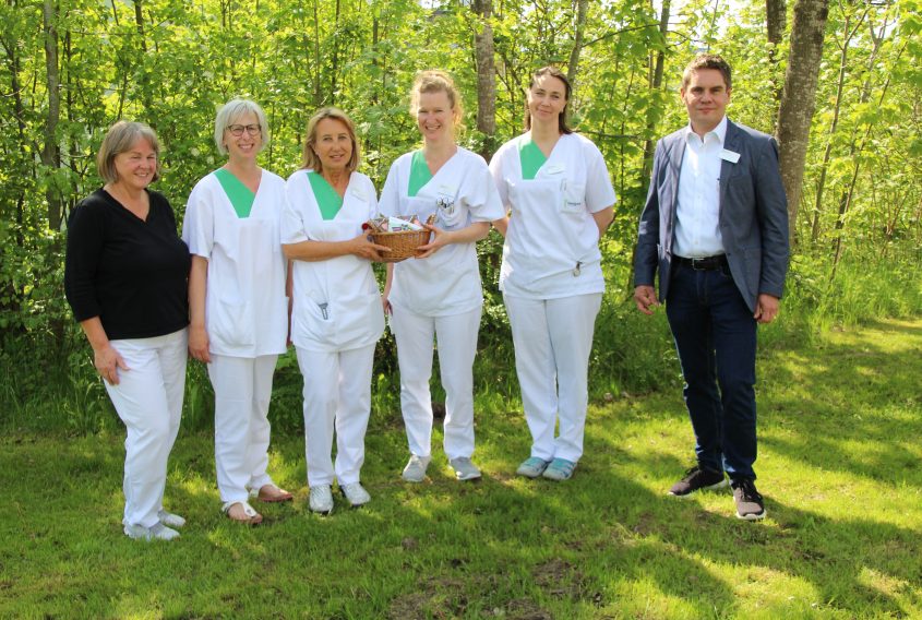 Die Pflegekräfte der Paracelsus Klinik Scheidegg waren sehr überrascht, als Klinikmanager Schömig mit den Schokoladentafeln im Pflegezentrum der Klinik auftauchte. Und natürlich freuten sich die Pflegekräfte sehr über die kleine, süße Aufmerksamkeit, verbunden mit dem persönlichen Dank des Klinikmanagers.